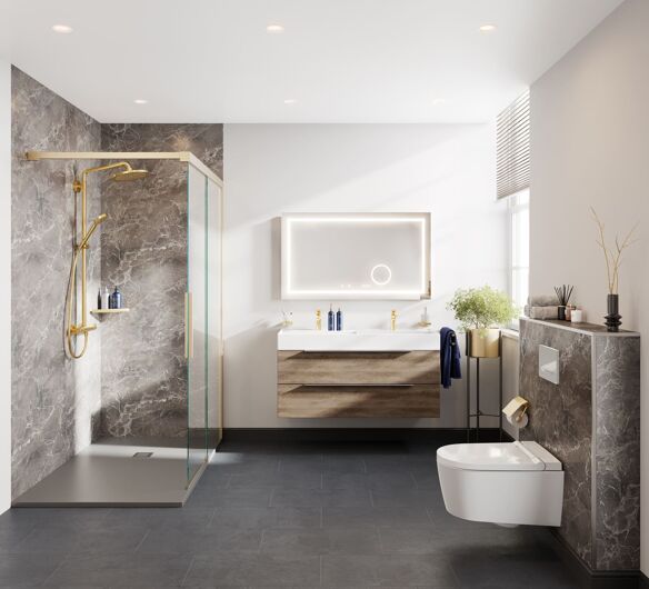 Met badkamer Hotel Chic creëer je het ultieme hotelgevoel in je eigen huis. Chique kranen en marmerlook wandpanelen stralen luxe uit, terwijl houten accenten en gouden details zorgen voor een warme, elegante uitstraling.