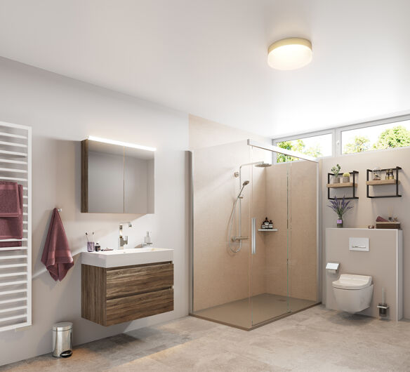 Waan jezelf in een oase van rust. Met Wallpanels in lichte aardetinten en subtiel ogende details is deze moderne badkamer een plek om ultiem te ontspannen. Aangevuld met accessoires volgens de modernste technieken, zoals een spiegel met ingebouwd licht en een functie voor ontwaseming.