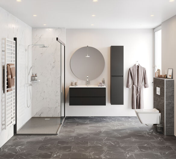 De Marmer Klassiek badkamer heeft een traditionele uitstraling met een moderne touch. Door de donkere details in de vloeren en de marmerlook Wallpanels straalt deze badkamer luxe uit. Dat wordt versterkt door de moderne badkamermeubels en verfijnde details, zoals een ronde spiegel.