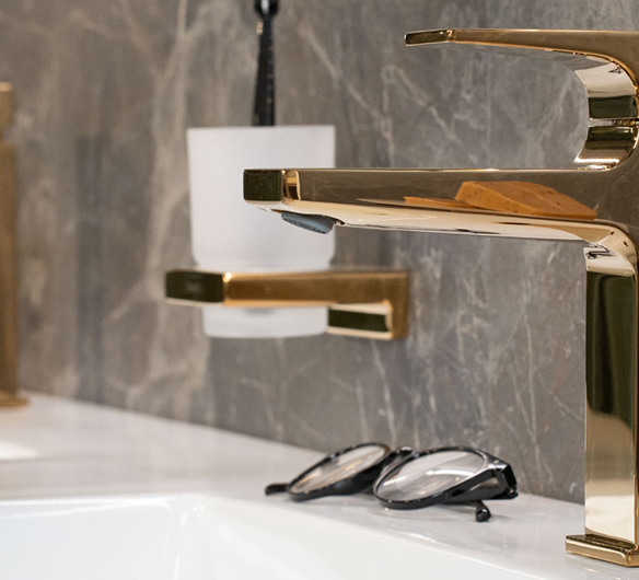Gouden details zijn een echte eyecatcher in de badkamer. Dan is het belangrijk om een goede balans aan te brengen in de rest van de badkamer. Kies daarom voor een rustige basis. Dat doe je bijvoorbeeld met de juiste Wallpanels. Wandpanelen met een lichte marmerlook of een rustig design passen heel mooi bij gouden badkamergarnituur. Benieuwd naar de volledige collectie Wallpanels van Molenaar? Kom eens langs in een van onze showrooms!