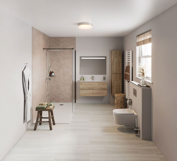 De landelijke badkamer kenmerkt zich door het gebruik van warme en natuurlijke materialen, zoals hout. Het kleurenpalet van een landelijke badkamer bestaat uit rustige, lichte en warme tinten. Kun je moeilijk kiezen tussen verschillende badkamerstijlen? De landelijke badkamerstijl leent zich uitstekend voor het combineren met andere stijlen! Vervang bijvoorbeeld de Wallpanels in de landelijke badkamer door de moderne Wallpanels met marmerlook uit de marmer chique badkamerstijl. Landelijk met een twist!
